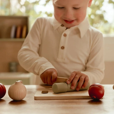 Zestaw znakomicie sprawdzi się podczas nauki kolorów, kształtów oraz podstaw zdrowego odżywiania. To także idealne uzupełnienie kuchennej serii Little Dutch, które wzbogaca zabawę w gotowanie i rozwija wyobraźnię. Dziecko może kroić, przygotowywać potrawy i naśladować dorosłych, ćwicząc przy tym precyzję oraz koordynację ręka–oko.