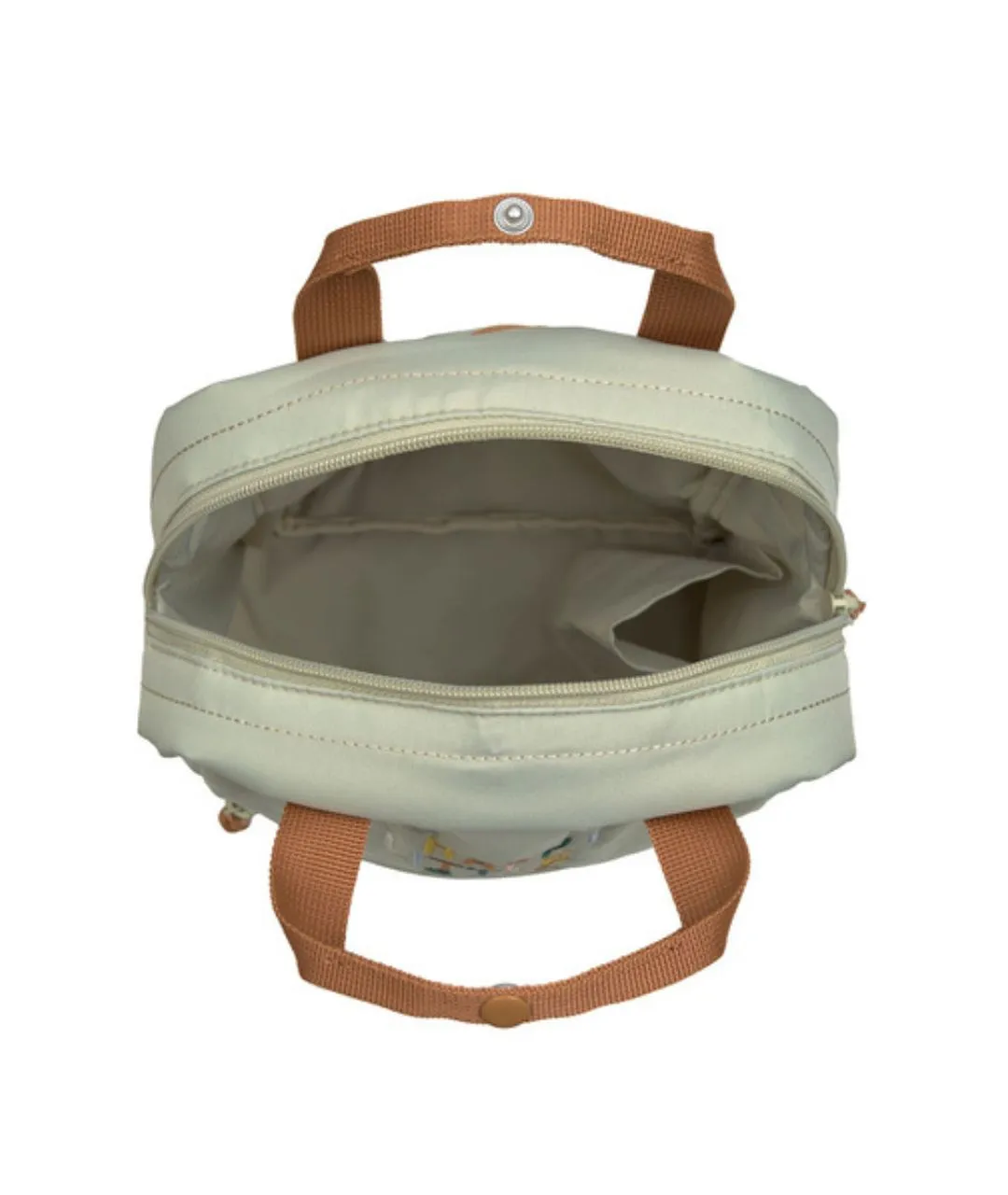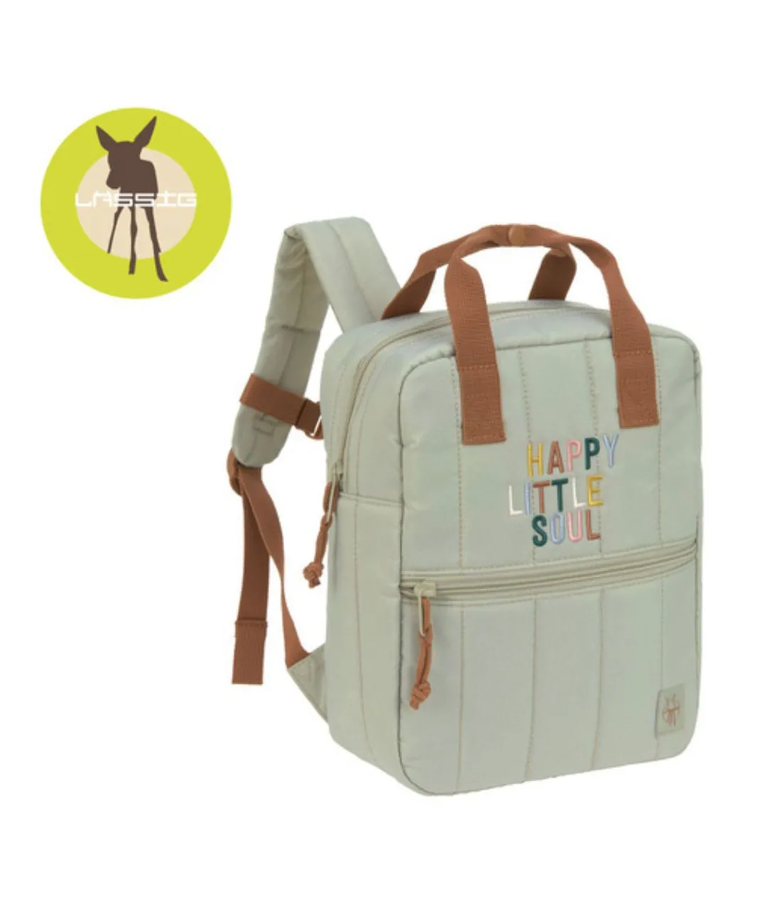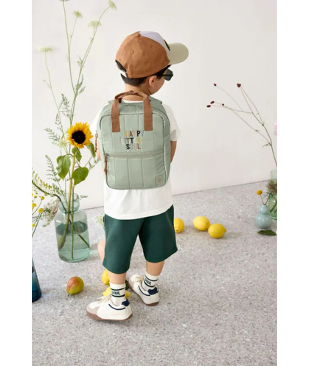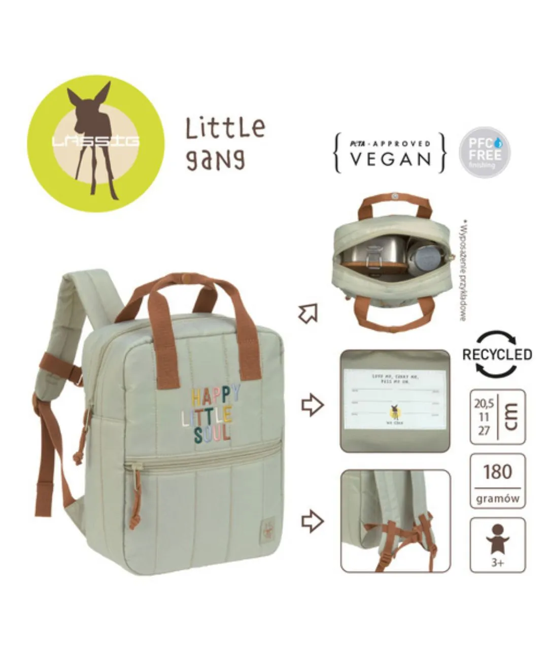 Design: jasny khaki materiał kontrastuje z karmelowymi detalami, takimi jak rączki, regulowane pasy czy ozdobne sznureczki przy suwakach. Z przodu znajduje się uroczy kolorowy napis „Happy Little Soul”. Materiał jest łatwy w czyszczeniu i odporny na wilgoć.