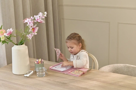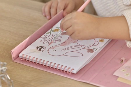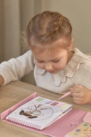 Zestaw kolorowanek wodnych i naklejek Rosa & Friends z kolekcji Fairy Garden od Little Dutch. To urocza propozycja dla małych artystów, którzy kochają odkrywać świat barw w kreatywny sposób. W środku znajdują się ilustracje pełne wróżek, kwiatów i leśnych stworzeń, które ożywają po zetknięciu z wodą. Wystarczy zamoczyć dołączony pędzelek, dotknąć nim pasków z farbą na dole strony i zacząć malować, a kolory natychmiast pojawią się na obrazku. To czysta magia bez bałaganu idealna zarówno w domu, jak i w podróży. Trwałe materiały, piękne ilustracje i łatwość użycia sprawiają, że zestaw doskonale rozwija kreatywność, motorykę małą i daje dzieciom ogrom radości podczas każdej kolejnej przygody z malowaniem.